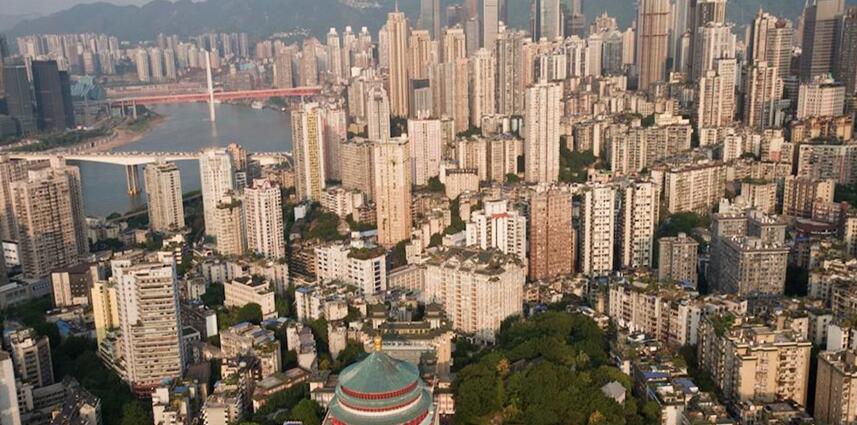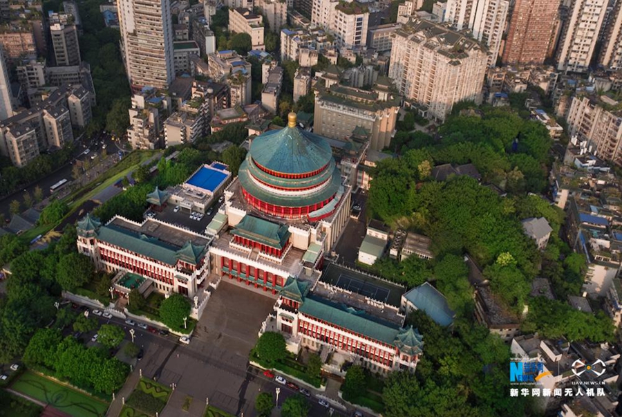 新中国成立后,当时的建设者们决定在重庆建造一座大礼堂,著名建筑师张家德担任大礼堂的设计师,礼堂主体融天坛祈年殿和天安门城楼特点于一体,再配以两翼廊道和塔楼,以明清建筑风格的路线,展现整体建筑的典雅大方。图为航拍重庆人民大礼堂,大礼堂气势雄伟,是中国传统宫殿建筑风格与西方建筑的大跨度结构巧妙结合的杰作。