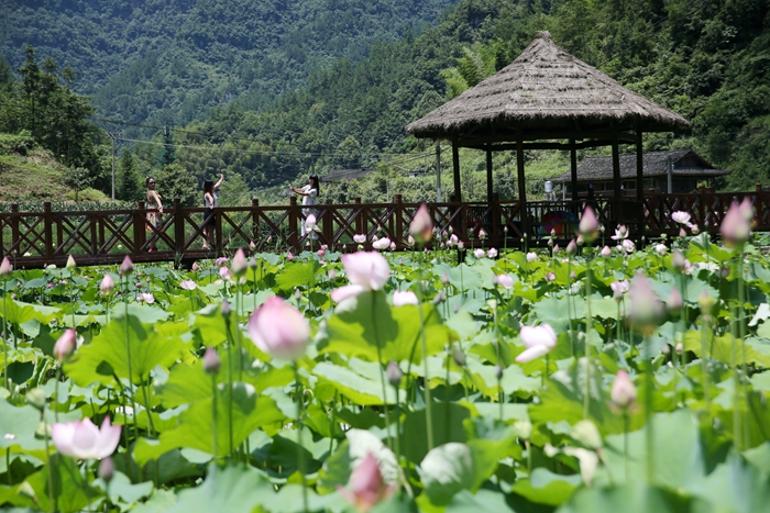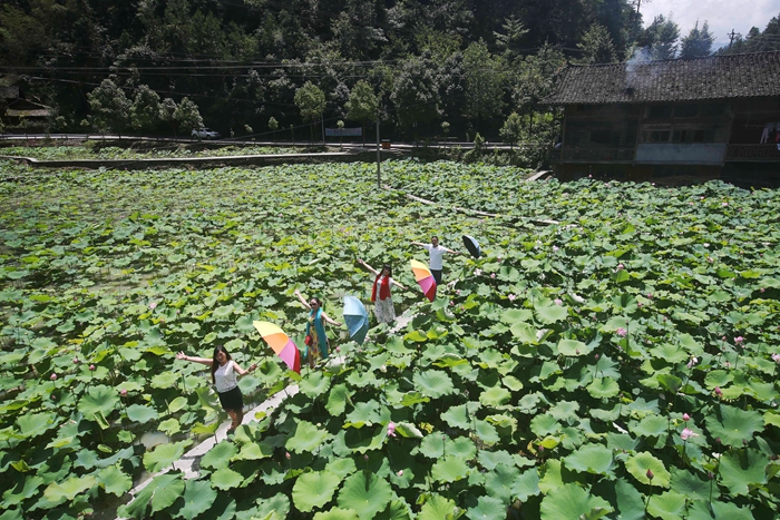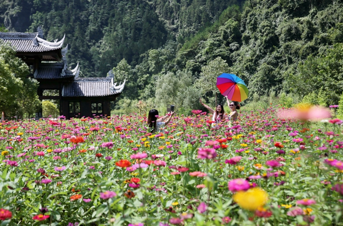 位于黔江区小南海镇的板夹溪十三寨,是黔江区保存最为完好的土家民居群落之一。板夹溪是地震堰塞湖小南海的主要水源,沿着板夹溪逆流而上,这里分布着13个原始古朴的土家山寨,土家人在此逐水而居,聚族成寨,形成了独具特色的民居群落。时下,去年打造的十三寨花海已经形成,各种花儿开得正艳,成为十三寨的另一道景观,吸引了不少游客前往观光旅游。